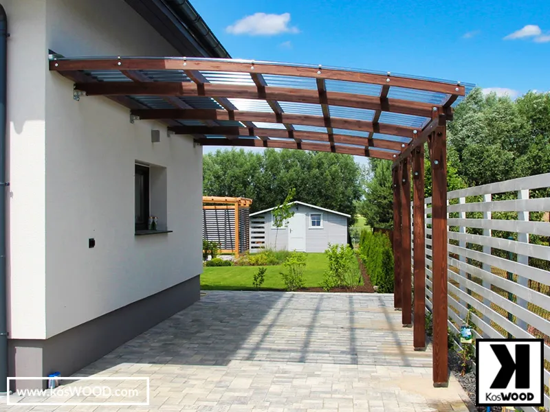 Co więcej, dostępne w KosWOOD wiaty garażowe z drewna klejonego, mogą być pomalowane na dowolny kolor z palety farb impregnujących firmy Teknos.